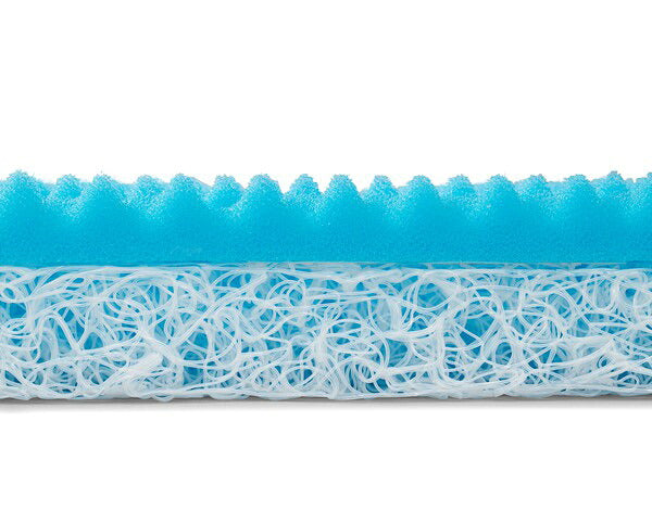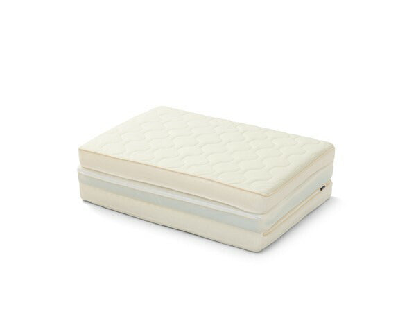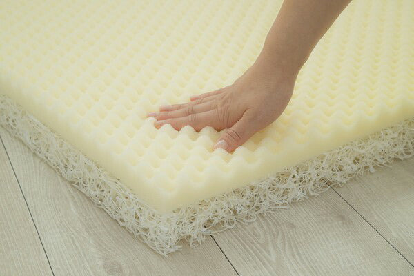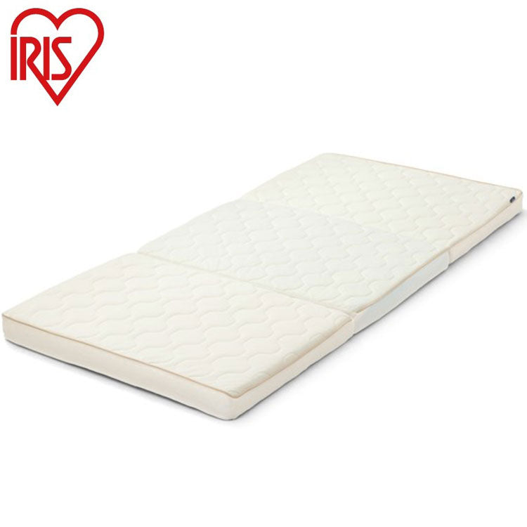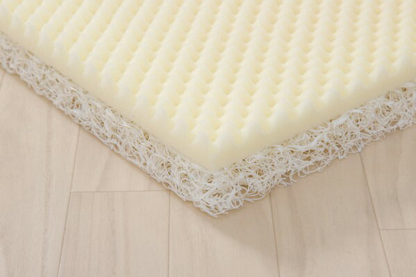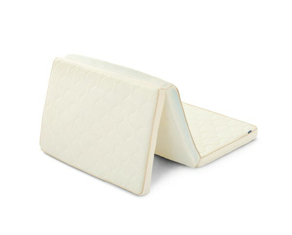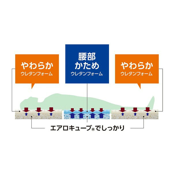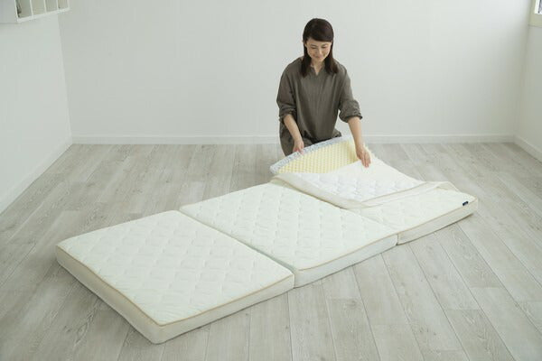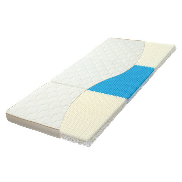 硬さの違うウレタンと高反発エアロキューブの2層構造で、2種類の寝心地を選べるリバーシブルタイプのマットレスです。沈み込みやすい腰部は硬め、頭部・脚部はやわらかいウレタンで体をしっかり支えます。さらにエアロキューブで支えることで体圧分散を高め、体の負担を軽くします。表はニット生地、裏はメッシュ生地なので、オールシーズン使用できます。コンパクトに収納できる三つ折りタイプです。