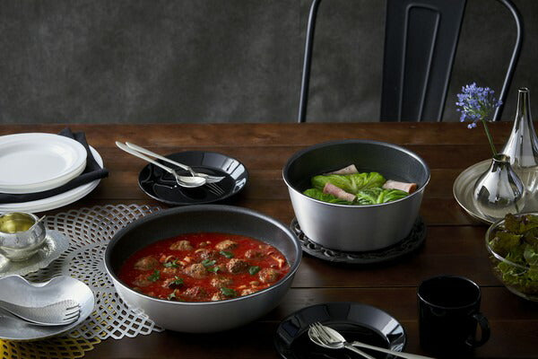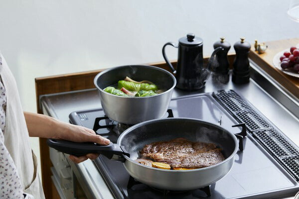 【フライパン・なべ・炒めなべ・エッグパン】表面加工/内側:ふっ素樹脂塗膜加工(ダイヤモンドコーティング)、外側:焼付塗装加工(底面を除く)、材質/本体:アルミニウム合金(はり底含む底の厚さ4.5mm)、はり底:ステンレス鋼(クロム16%) 【ガラスふた】ふた本体:強化ガラス(全面物理強化)、金属部:ステンレス鋼(クロム18%、ニッケル8%) 【マルチハンドル】樹脂部:フェノール樹脂、ナイロン、金属部:ステンレス鋼(クロム18%、ニッケル8%)、ゴム部:シリコーンゴム