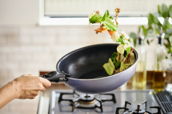 【フライパン・炒めなべ・なべ・エッグパン】表面加工/内側:ふっ素樹脂塗膜加工(ダイヤモンドコーティング)、外側:焼付塗装加工(底面を除く)、材質/本体:アルミニウム合金(はり底含む底の厚さ4.5mm)、はり底:ステンレス鋼(クロム16%) 【ガラスふた】ふた本体:強化ガラス(全面物理強化)、ゴム部:シリコーン 【PEシールふた】原料樹脂:ポリエチレン(耐熱温度80℃) 【マルチハンドル】樹脂部:フェノール樹脂、ナイロン、金属部:ステンレス鋼(クロム18%、ニッケル8%)、ゴム部:シリコーンゴム