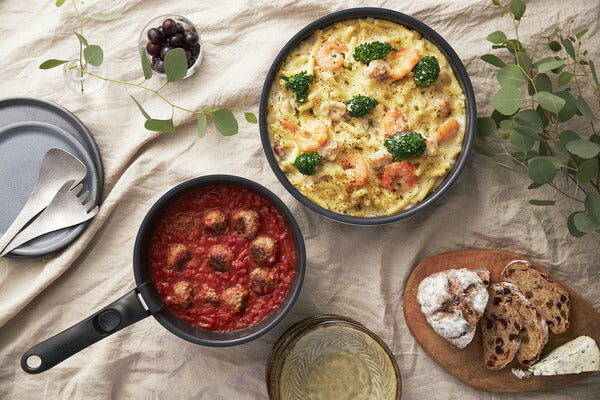 基本仕様 セット内容 フライパン26cm、なべ20cm、マルチハンドル 満水容量(約) フライパン26cm:3.3L、なべ20cm:2.4L 対応熱源 ガスコンロ・ラジエントヒーター・オーブン・その他の電気ヒーター対応(※IH調理器、電子レンジでは使用できません。)