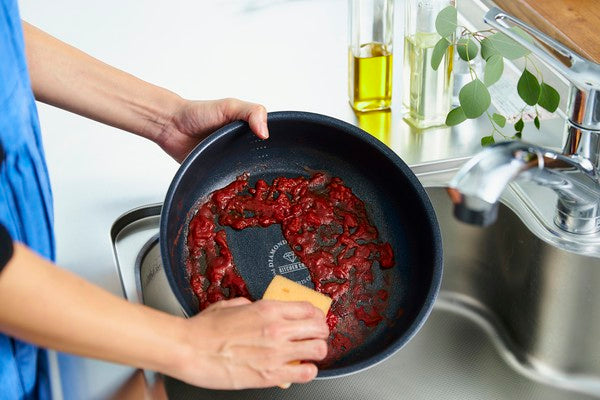 ダイヤモンドコーティングを使用した、こびりつきにくく丈夫で長持ちするフライパン・なべのセットです。ダイヤモンドコーティングとは、人工ダイヤモンドを細かい粒子状にしてふっ素樹脂コーティングに配合したものです。汚れがつきにくく、ハンドルをはずして丸洗いができ、お手入れも簡単です。日本の食文化に合わせフライパンを深型にしているので、煮物や汁物など幅広く使えます。フライパンとなべには便利な目盛り線が付いています。ハンドルの着脱は簡単で、握るだけで取り付けができ、ロック解除レバーを押すだけで外すことが出来ます。使用しないときは重ねて省スペースで収納できます。