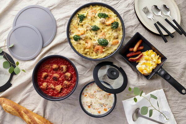 基本仕様 セット内容 フライパン26cm、なべ16cm・20cm、エッグパン、ガラスふた16cm・20cm、PEシールふた16cm・20cm、マルチハンドル 満水容量(約) フライパン26cm:3.3L、なべ16cm:1.4L、なべ20cm:2.4L、エッグパン:1.1L エッグパン寸法(約) 20×14cm 対応熱源 ガスコンロ・ラジエントヒーター・オーブン・その他の電気ヒーター対応(※IH調理器、電子レンジでは使用できません。)