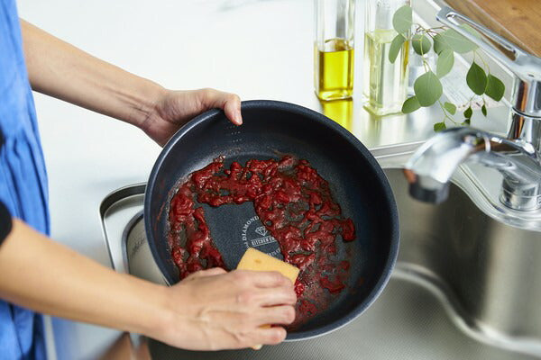 ダイヤモンドコーティングを使用した、こびりつきにくく丈夫で長持ちするフライパン・なべのセットです。ダイヤモンドコーティングとは、人工ダイヤモンドを細かい粒子状にしてふっ素樹脂コーティングに配合したものです。汚れがつきにくく、ハンドルをはずして丸洗いができ、お手入れも簡単です。日本の食文化に合わせフライパンを深型にしているので、煮物や汁物など幅広く使えます。フライパンとなべには便利な目盛り線が付いています。ハンドルの着脱は簡単で、握るだけで取り付けができ、ロック解除レバーを押すだけで外すことが出来ます。ガラスふたのつまみは伸縮するので使わない時は、コンパクトに収納できます。使用しないときは重ねて省スペースで収納できます。