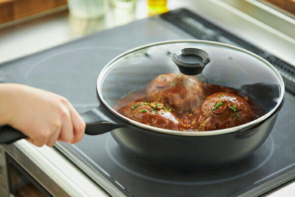 【フライパン】表面加工/内側:ふっ素樹脂塗膜加工(ダイヤモンドコーティング)、外側:ふっ素樹脂塗膜加工、材質/本体:アルミニウム合金(はり底含む底の厚さ4.5mm)、はり底:ステンレス鋼(クロム16%)、ハンドル:フェノール樹脂(耐熱温度150℃) 【ガラスふた】ふた本体:強化ガラス(全面物理強化)、金属部:ステンレス鋼(クロム16%、ニッケル3.5%)、樹脂部:フェノール樹脂