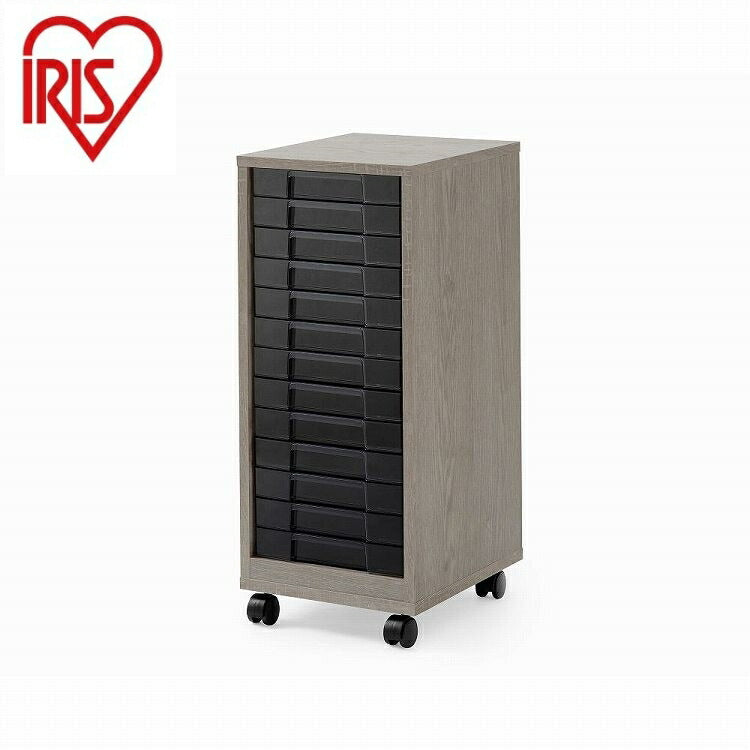 ウッド調のオフィスや家庭のインテリアにも良く合う木製のフロアケースです。デスク横での使用に最適な高さの浅型13段タイプです。キャスターが付いているので移動にとても便利です。