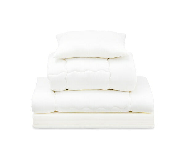 基本仕様 セット内容 掛け布団、敷き布団(低反発ウレタンフォーム入り)、枕、掛け布団カバー、ボックスシーツ、枕カバー2枚、除湿シート、三つ折りマットレス、収納バッグ