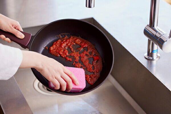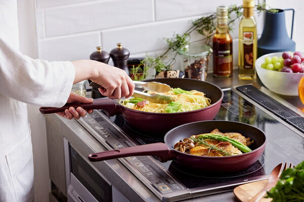 ダイヤモンドコーティングを使用した、こびりつきにくく丈夫で長持ちするフライパンです。ダイヤモンドコーティングとは、人工ダイヤモンドを細かい粒子状にしてふっ素樹脂コーティングに配合したものです。汚れがつきにくいので、お手入れも簡単です。メタリック仕上げで高級感のあるカラーです。ハンドルはリベット(ねじ)が表に出ていないので、スマートで洗いやすいデザインです。シリコン塗装で滑りにくくなっています。壁掛け収納の際にもおしゃれな背面に仕上げました。