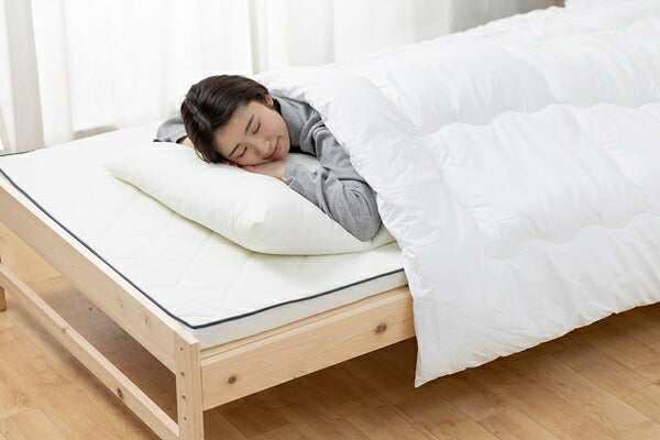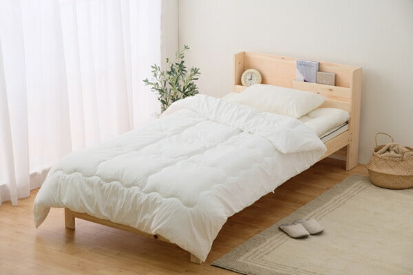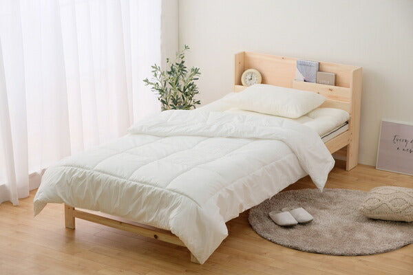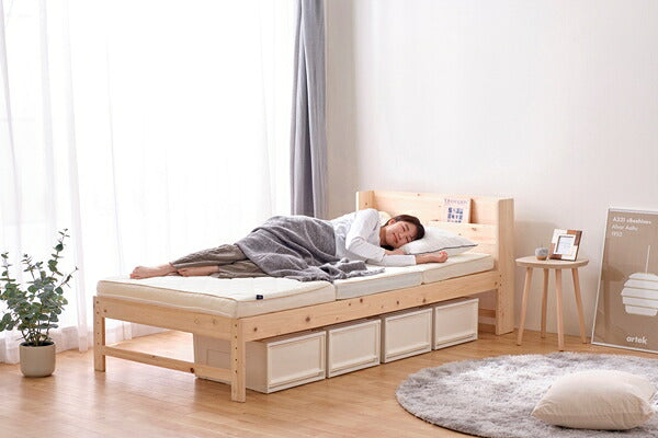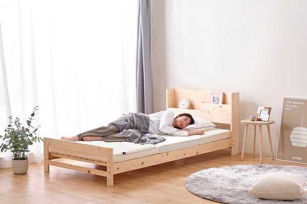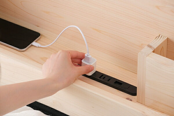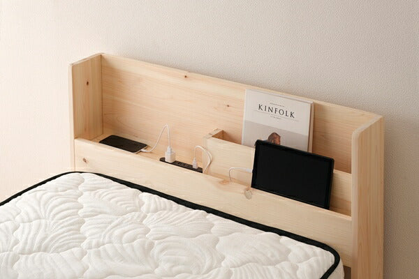 安心の耐荷重200kgの頑丈な総ヒノキすのこベッドです。きしみを気にせず、寝返りができる高耐荷重設計です。通気性抜群で湿気が溜まりにくく、オールシーズン快適です。ヘッドボードはブックスタンド、タブレットやスマホスタンドになります。2口コンセントとUSBタイプAポート付きです。ライフスタイルに合わせて、ベッドの高さは4段階調節ができます。癒し効果のあるヒノキ材を贅沢に使用しています。ベット下の空間は収納スペースとして有効活用できます。どんなお部屋にも馴染みやすいシンプルなナチュラルカラーです。