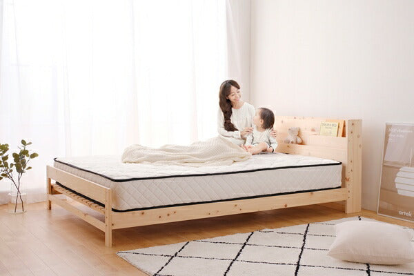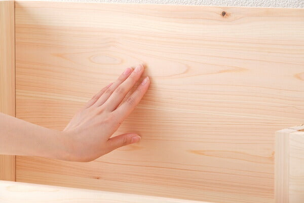 安心の耐荷重200kgの頑丈な総ヒノキすのこベッドです。きしみを気にせず、寝返りができる高耐荷重設計です。通気性抜群で湿気が溜まりにくく、オールシーズン快適です。ヘッドボードはブックスタンド、タブレットやスマホスタンドになります。2口コンセントとUSBタイプAポート付きです。ライフスタイルに合わせて、ベッドの高さは4段階調節ができます。癒し効果のあるヒノキ材を贅沢に使用しています。ベット下の空間は収納スペースとして有効活用できます。どんなお部屋にも馴染みやすいシンプルなナチュラルカラーです。