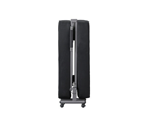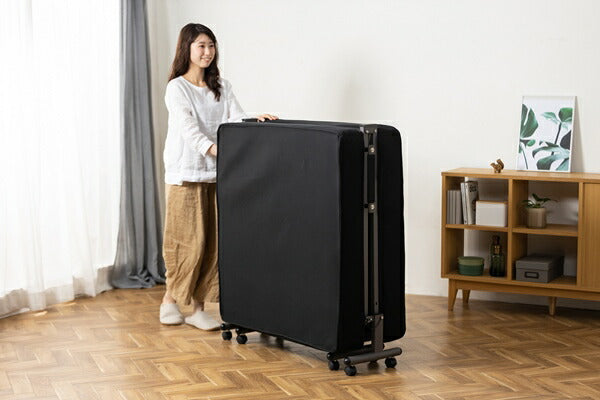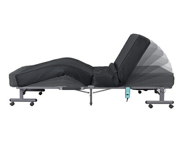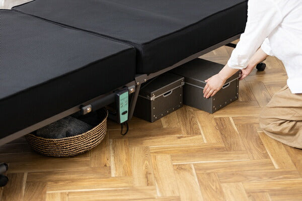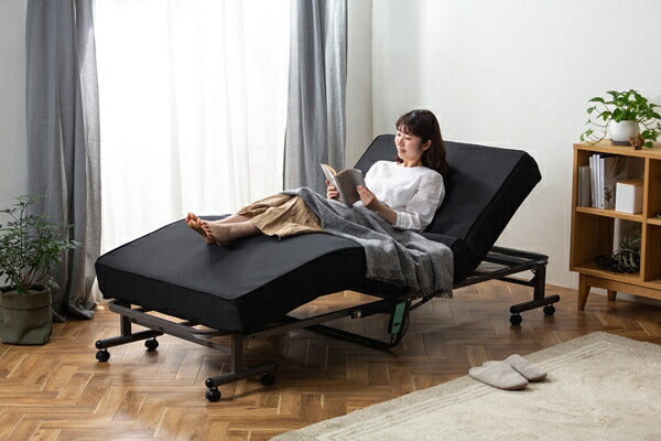 組立不要で、すぐに使える折りたたみ電動リクライニングベッドです。背もたれと脚部の2か所がリクライニングします。リモコンの『あがる』・『さがる』ボタンで簡単に操作ができ、お好みの角度でお使いいただけます。背もたれは無段階調節できます。脚部も背もたれに連動して高さ調節ができます。(背もたれまたは脚部のみの操作はできません)。マット部には体圧分散性に優れたポケットコイルを採用しています。コイルがポケットに包まれ独立しているので、複数の点で身体を支え、振動や横揺れが少なく、理想的な寝姿勢へ導きます。使いやすい高さ設計にこだわっています。マット部までの高さが約40cmと乗り降りしやすく、ベッド下の高さは約25cmで収納スペースとして有効活用できます。リモコンを使わないときはベッドサイドにかけて収納ができます。折りたたみ時や移動時に便利なサイドグリップ付きです。キャスター付きで、移動が楽に行えます。4か所ロック付きです。