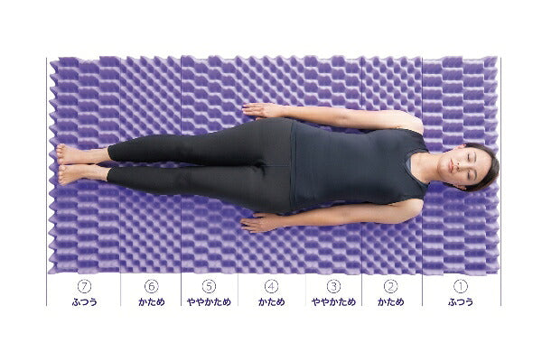 体の部位に合わせたかたさの異なるウレタンウォームを、7つにゾーニングし、睡眠時の理想的な姿勢である立位姿勢を促し、質の良い睡眠をサポートします。マットレス表面の凹凸を3種類の形状にし、サポートする部位に合わせてかたさを変えることで、体圧を分散させ負担のかかりにくい寝姿勢を促します。プロファイル加工により、マットレスと体の間に空気の通り道が生まれ、睡眠中のムレを防ぎます。単品使いやお使いの布団やマットレスの上に重ねてご使用いただけます。カバーは面ファスナー付きで持ち運びや収納も楽に行えます。ロール状に圧縮梱包してあるので、持ち帰りや搬入が簡単です。開封後、数日で本来のサイズに復元します。(※復元後は、元のロール状態に戻すことができません。)国内工場で生産(充填・加工)しています。