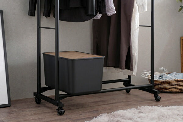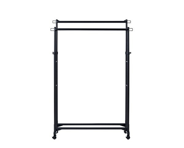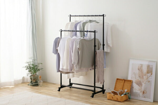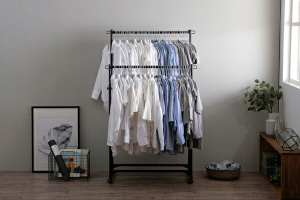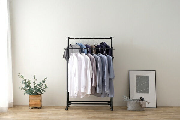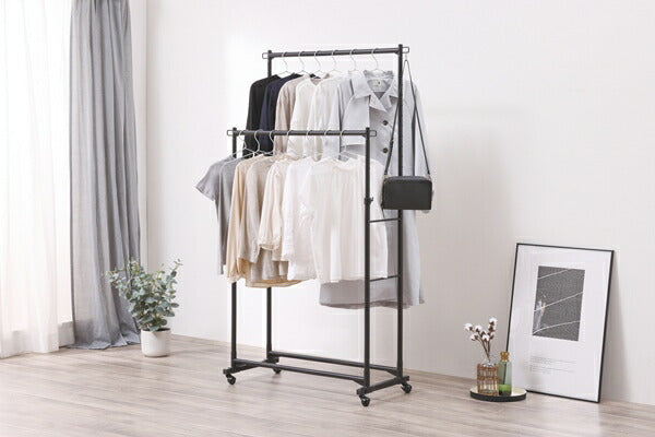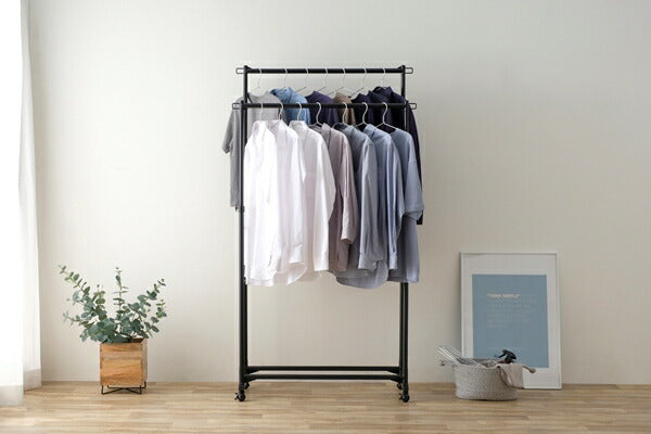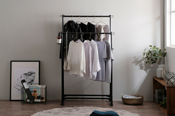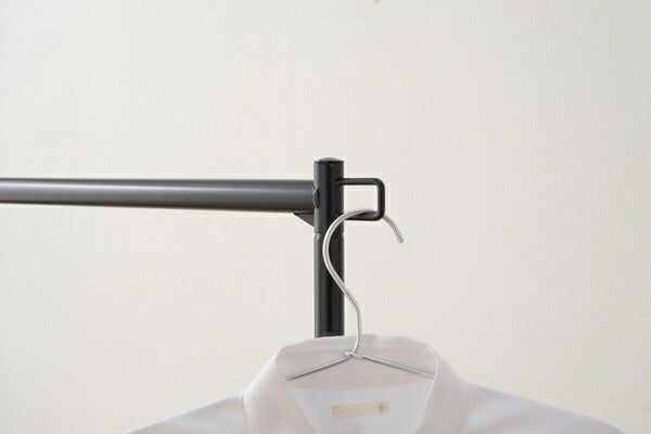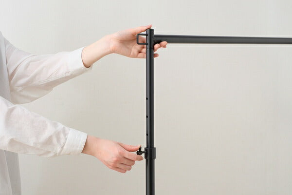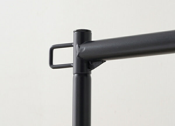 スタイリッシュなデザインと機能を兼ね備えたハンガーラックです。高耐荷重設計でたくさん掛けてもぐらつきにくく、安定感抜群です。高さは5cm間隔で、12段階調整可能です。服の丈に合わせて高さを決め、ボルトでしっかり固定できます。サイドフックは使用頻度の高い服やバッグなどを掛ける際に便利です。サイドバー付きで、ストールやネクタイ、ベルトなどを掛けられます。ハンガー下のスペースは収納物やボックスなどが置け、空間を有効活用できます。キャスター付きで移動がスムーズに行えます。ストッパー付きが2個です。ハンガーだけでなく、キャスターやねじなどのパーツもすべてブラックで統一しています。マットな質感でインテリアにも馴染み、キズやサビに強い塗装で長くお使いいただけます。お客様組み立てとなります。