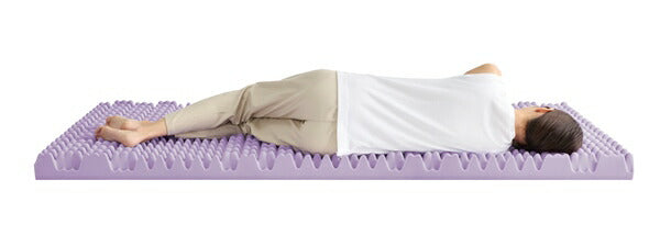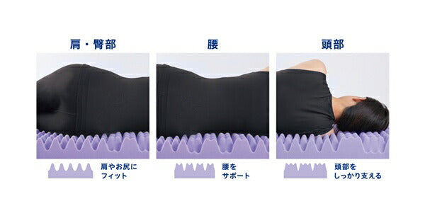 体の部位に合わせたかたさの異なるウレタンウォームを、7つにゾーニングし、睡眠時の理想的な姿勢である立位姿勢を促し、質の良い睡眠をサポートします。マットレス表面の凹凸を3種類の形状にし、サポートする部位に合わせてかたさを変えることで、体圧を分散させ負担のかかりにくい寝姿勢を促します。プロファイル加工により、マットレスと体の間に空気の通り道が生まれ、睡眠中のムレを防ぎます。単品使いやお使いの布団やマットレスの上に重ねてご使用いただけます。カバーは面ファスナー付きで持ち運びや収納も楽に行えます。ロール状に圧縮梱包してあるので、持ち帰りや搬入が簡単です。開封後、数日で本来のサイズに復元します。(※復元後は、元のロール状態に戻すことができません。)国内工場で生産(充填・加工)しています。