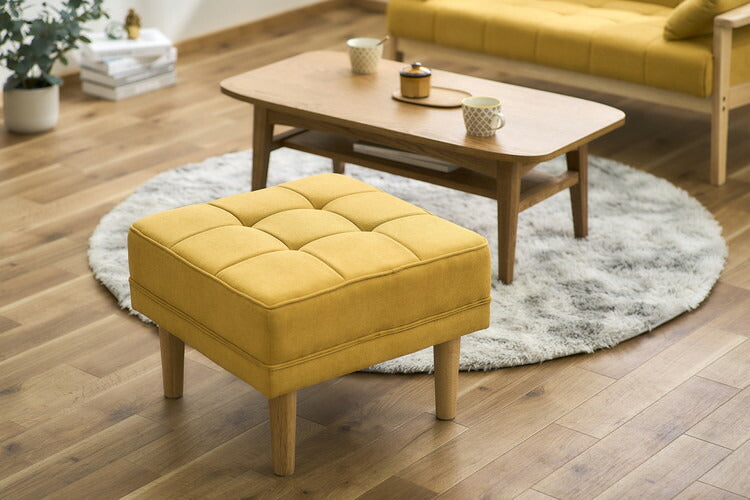 脚部分に天然木を使用し、ファブリック生地と合わせたオットマンです。お部屋に温かみとやわらかさをプラスします。ソファと併用することで、オットマンとして使用できます。足を伸ばしくつろげます。またソファの横にサイドテーブルとして置き、スマホや本などが置けます。単体で1人掛けスツールとしてもお使いいただけます。座面下の高さも十分にあり、お掃除もラクに行えます。脚を取り付けるだけの簡単組み立てです。組立式なので梱包サイズはコンパクトで、軽自動車でも持ち帰り可能なサイズです。
