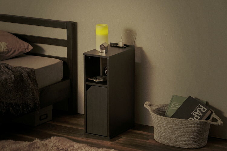 幅が約18cmのスリムなナイトテーブルです。生活感を隠せる扉付きタイプです。ベッドサイドやソファの横、デスク下などに置けるコンパクトなサイズです。ほこりガード付きの電源タップを取り付けられます。スマホの充電などに便利です。タブレットやスマホが置けるスタンド付きです。動画の視聴もできます。下棚は3.2cm間隔で、5段階調整可能な可動棚になっているので、収納物に合わせて自由に調整できます。お客様組み立てとなります。