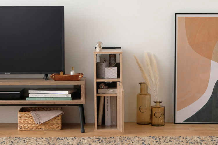 幅が約18cmのスリムなナイトテーブルです。生活感を隠せる扉付きタイプです。ベッドサイドやソファの横、デスク下などに置けるコンパクトなサイズです。ほこりガード付きの電源タップを取り付けられます。スマホの充電などに便利です。タブレットやスマホが置けるスタンド付きです。動画の視聴もできます。下棚は3.2cm間隔で、5段階調整可能な可動棚になっているので、収納物に合わせて自由に調整できます。お客様組み立てとなります。