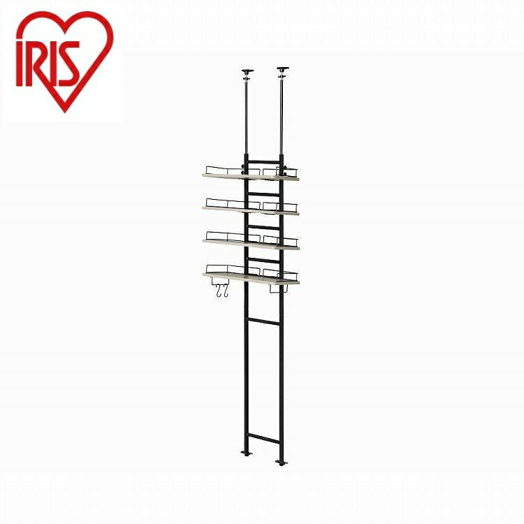 省スペースで設置可能な突っ張り式のランドリーラックです。天井と床でつっぱるだけで設置ができます。つっぱりタイプなので、洗濯機サイズを気にせず設置可能です。洗濯パン上にも設置可能です。(※一部の洗濯パンには設置できない場合があります。)棚板はL字柵付きで、物の落下を防ぎます。4枚の棚板は8段階高さ調整が可能です。収納物に合わせて自由に調整できます。フックなので、棚板の移動が簡単にできます。ハンガーバーとS字フック付きで、ハンガーやタオル、ドライヤーなども掛けられ便利です。リビングやデスク脇、トイレラックなどの壁面収納としてもお使いいただけます。お客様組み立てとなります。