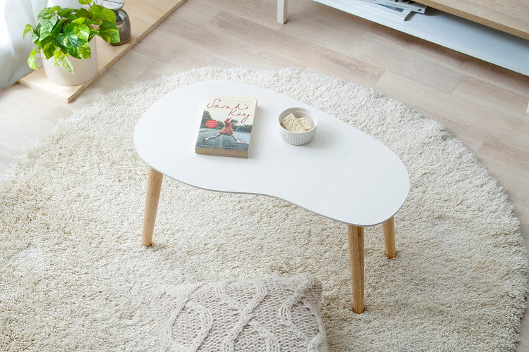 組み立て不要で、すぐに使える折り畳みセンターテーブルです。ビーンズ型でかわいらしいデザインです。天板がラウンドしているので、小さなお子様のいるご家庭でも安心です。清潔感のあるホワイトの天板とやわらかな木目の脚がかわいいバイカラーです。天板には熱、水、傷に強いメラミン樹脂を使用しています。脚はラッカー塗装が施されており柔らかい光沢があります。脚が折りたたみ可能で、使わない時はコンパクトに収納できます。ワンタッチレバーで簡単に折りたためます。