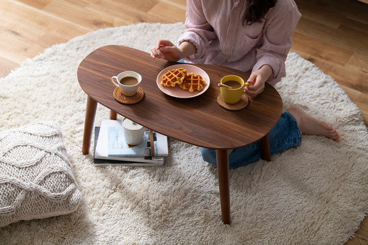 組み立て不要で、すぐに使える折り畳みセンターテーブルです。ビーンズ型でかわいらしいデザインです。天板がラウンドしているので、小さなお子様のいるご家庭でも安心です。天板は木目調で温かみがあるデザインです。天板には熱、水、傷に強いメラミン樹脂を使用しています。脚はラッカー塗装が施されており柔らかい光沢があります。脚が折りたたみ可能で、使わない時はコンパクトに収納できます。ワンタッチレバーで簡単に折りたためます。