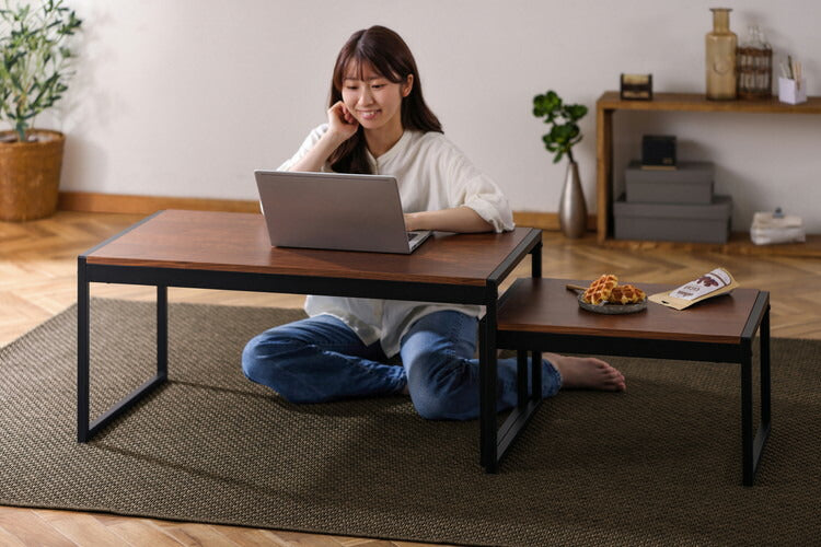 天然木とスチールをミックスすることで、お部屋をスッキリとした印象にするセンターテーブルです。天板には高級感のある突板を使用しています。スチール脚と天板をフラットな面に合わせることで、シンプルながらもデザイン性に優れた仕上げになっています。便利な2サイズセットです。用途に合わせて伸縮可能です。バラバラに置いて単品使いもできます。お客様組み立てとなります。
