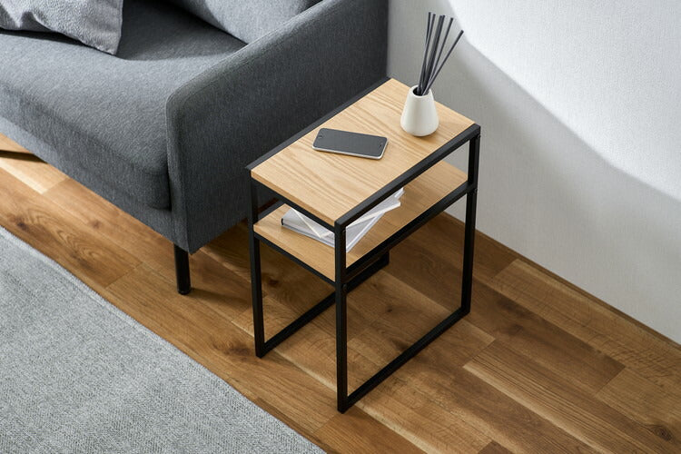 天然木とスチールをミックスすることで、お部屋をスッキリとした印象にするサイドテーブルです。天板下の棚は本や小物などを収納できます。天板と棚には高級感のある突板を使用しています。スチール脚と天板、棚をそれぞれフラットな面に合わせることで、シンプルながらもデザイン性に優れた仕上げになっています。場所を選ばずお使いいただけます。ベッドサイドやソファ横などに置けるコンパクトなサイズです。スチールフレームセンターテーブルとの併用もおすすめです。お客様組み立てとなります。