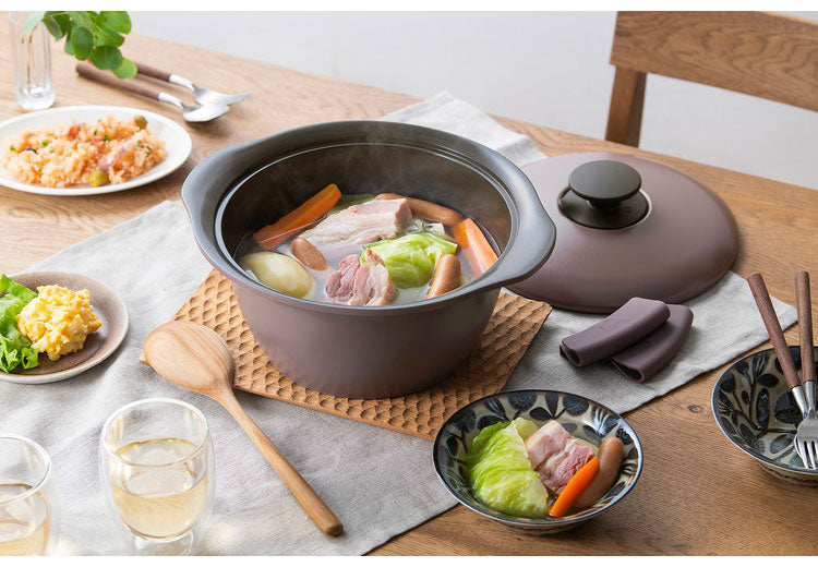 余分な水分を使わない調理が可能となります。食材からでるうまみを含んだ蒸気が、ふた裏面にある凸面を伝って食材にまんべんなく降り注ぐウォータードロップ現象により素材本来のおいしさを引き出します。専用のふた取っ手に開閉可能な蒸気口がある為、蒸気を調節できます。栄養を逃しにくく、おいしく作ることができます。熱伝導率がよく、時短調理をすることができます。耐磨耗性試験50万回クリアしたセラミックコーティング加工により、こびりつきにくく、汚れもスルっと落ちます。丸みのある形状とくすみカラーでかわいらしいデザインです。ガス火・IHに対応しています。