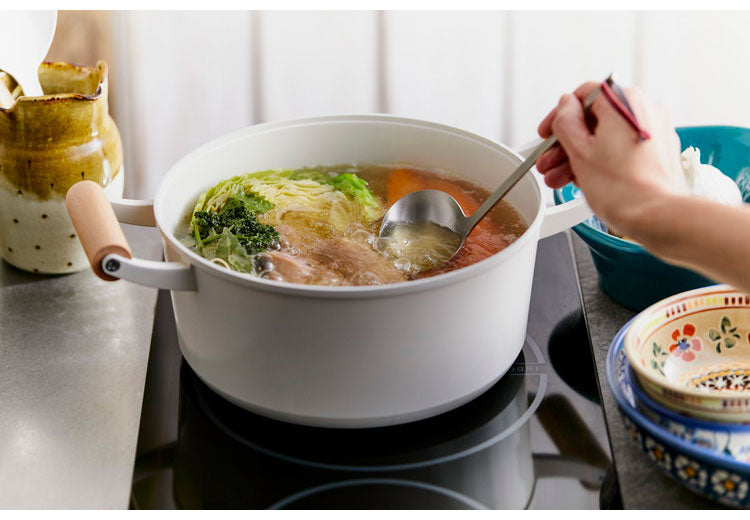 北欧をイメージしたデザインの無加水鍋です。耐磨耗性試験70万回クリアしたセラミックコーティング加工により、こびりつきにくく、汚れもスルっと落ちます。素材のうまみと水分を活かした、無加水調理が可能です。鍋とふたの間に蒸気の膜を作り、旨みを含んだ蒸気を逃がしにくい構造で、ふた裏の凸形状で蒸気を循環させます。焼く、煮る、炒めるなど様々な調理に使えます。天然木の取っ手やつまみを取り入れ、デザイン性をアップさせました。