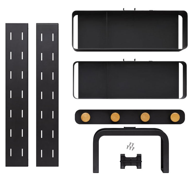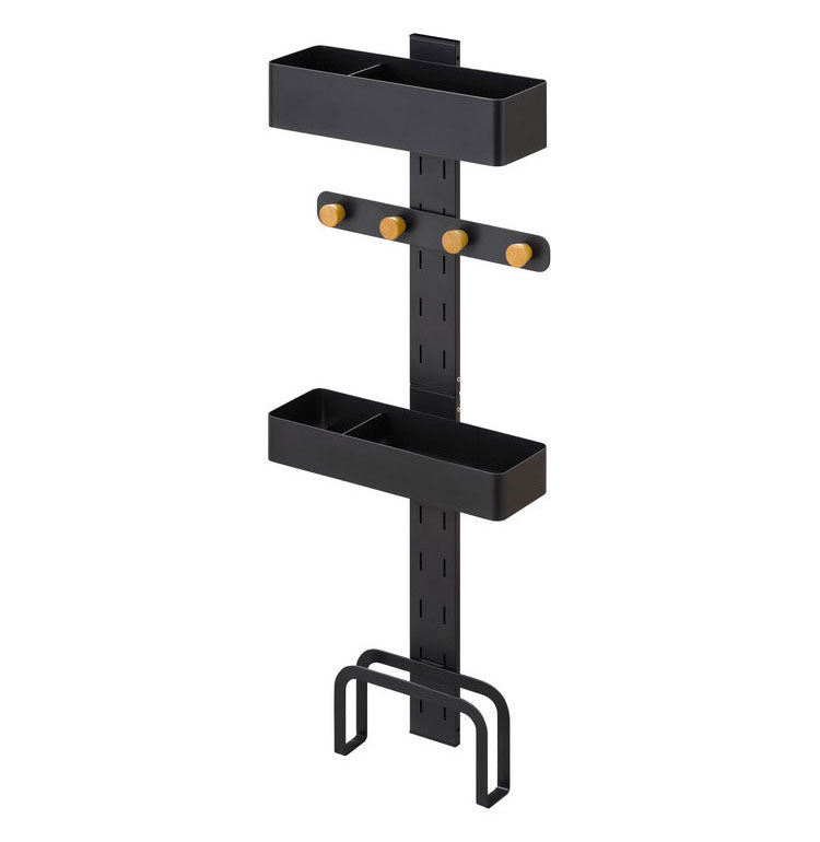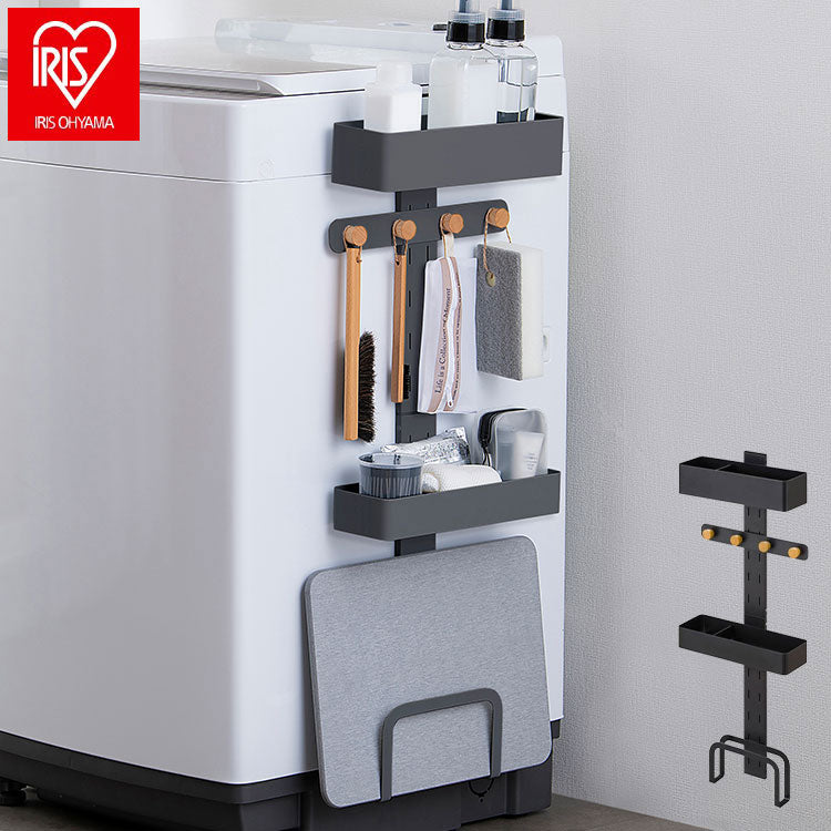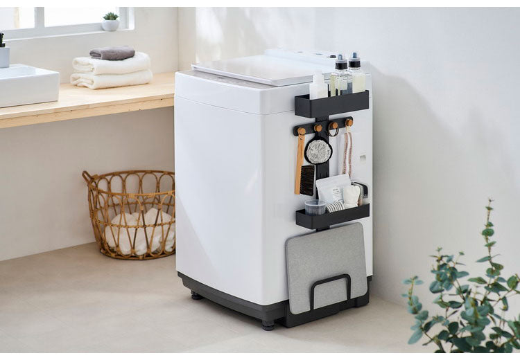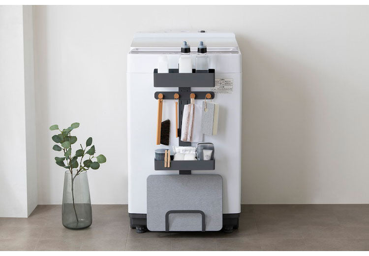 洗濯機周りの小物を収納できるランドリーマルチラックです。マグネット仕様で洗濯機の側面に簡単に取り付けられます。デッドスペースになりがちな洗濯機周りを収納スペースに変えられます。ボックスは洗剤や柔軟剤、フックは洗濯ネットや掃除用具、スタンドは体重計や珪藻土マットなどが収納できます。ボックス、木製フック、スタンドはお好みの高さに組み替えが可能です。木とスチールの組み合わせで上質なデザインです。滑り止めシリコンシートにより重さによるズレを防止します。お客様組み立てとなります。