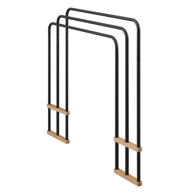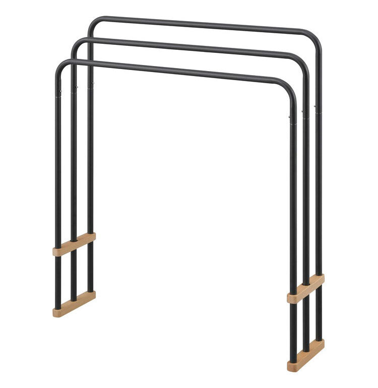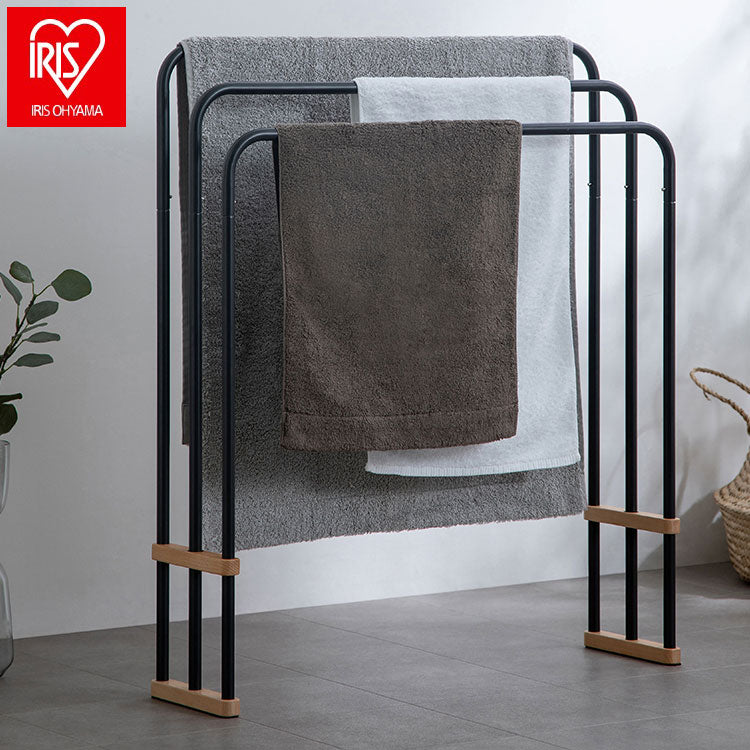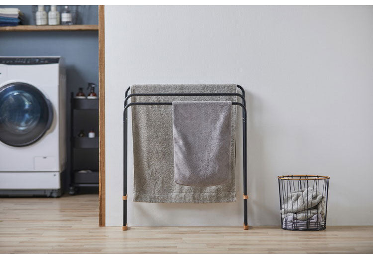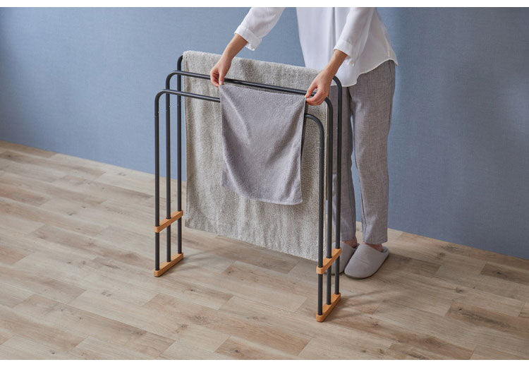 天然木とスチールの組み合わせでインテリアに合わせやすいデザインのバスタオルハンガーです。大判のバスタオルも干すことができます。横からスライドさせてスムーズにタオルを掛けられる設計です。使用しないときは折りたたんでコンパクトに収納できます。軽量で持ち運びもラクに行えます。お客様組み立てとなります。工具不要でパイプをつなげるだけの簡単組み立てです。