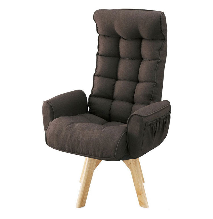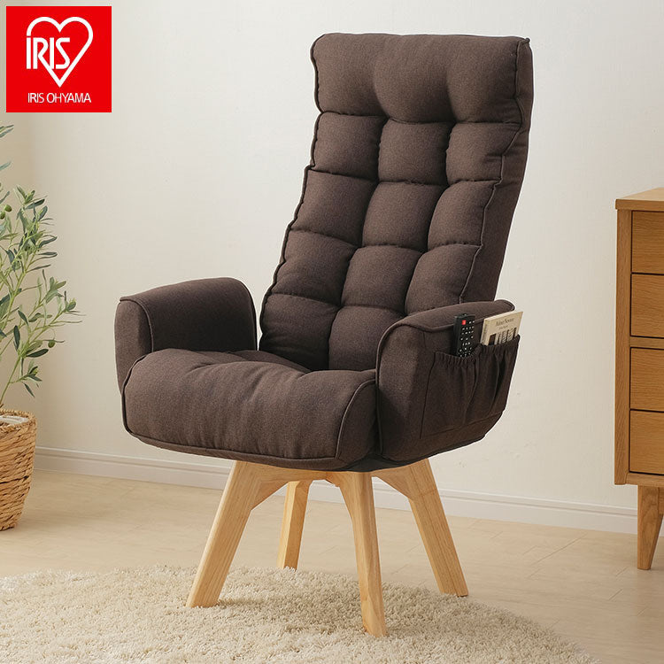 快適性とインテリア性を併せ持った回転ファブリックチェアです。背の高い男性でも首までゆったりもたれられるハイタイプです。座面が360度回転するので、立ち上がり時や物を取る時も便利です。座面が高いので座りやすく、立ち上がりも楽にできます。身体にフィットする座り心地で長時間座っていても快適です。使用しない時は、背面をたたむことができます。厚みのある肘掛けは、立ち座りの際に便利です。小物収納に便利なポケット付きです。お客様組み立てとなります。