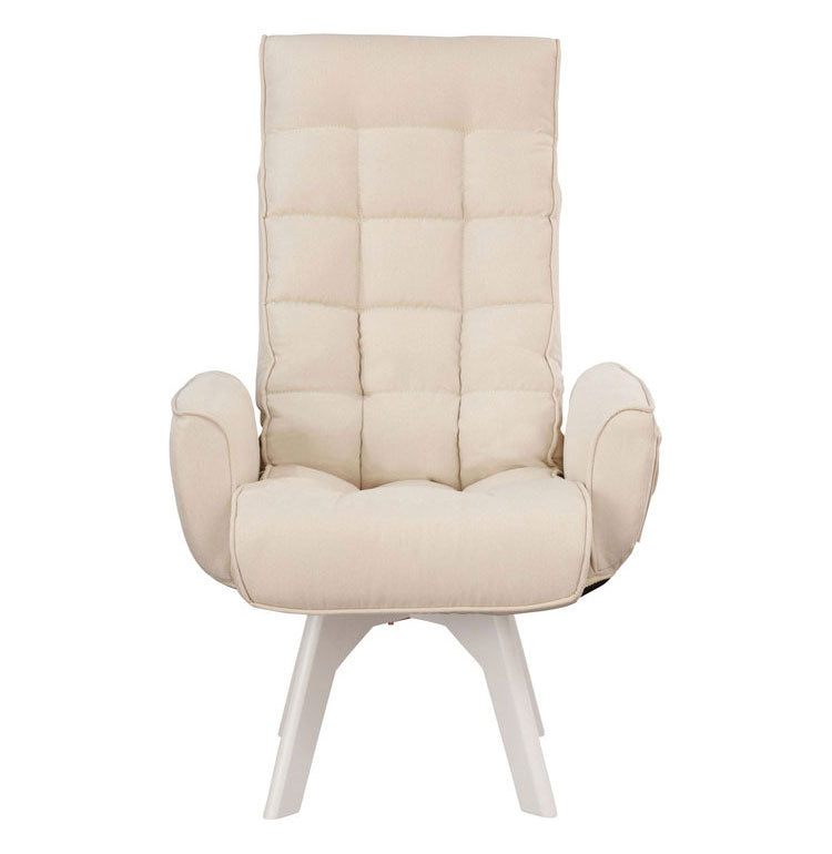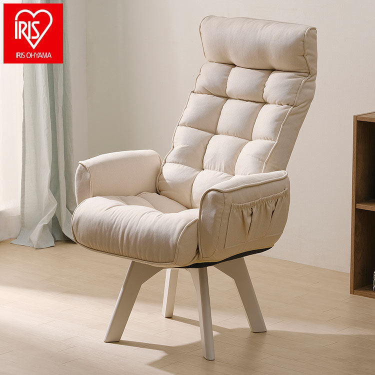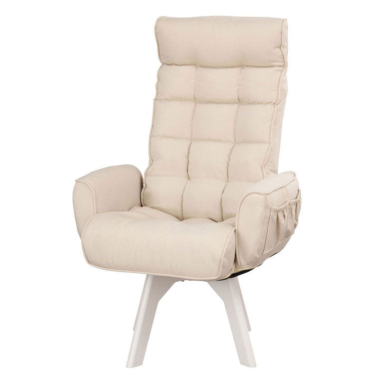 快適性とインテリア性を併せ持った回転ファブリックチェアです。背の高い男性でも首までゆったりもたれられるハイタイプです。座面が360度回転するので、立ち上がり時や物を取る時も便利です。座面が高いので座りやすく、立ち上がりも楽にできます。身体にフィットする座り心地で長時間座っていても快適です。使用しない時は、背面をたたむことができます。厚みのある肘掛けは、立ち座りの際に便利です。小物収納に便利なポケット付きです。お客様組み立てとなります。