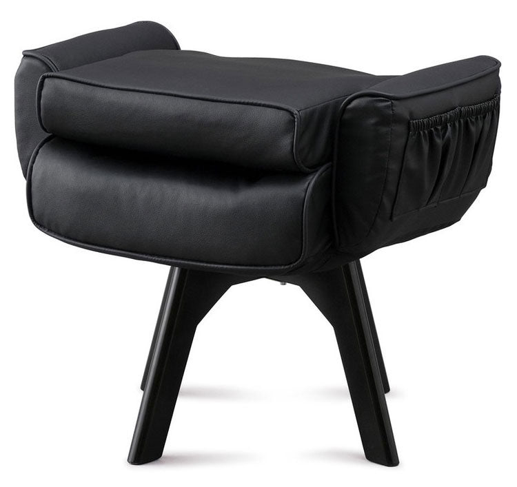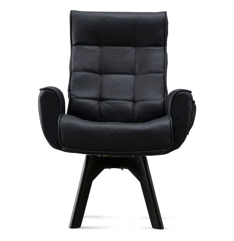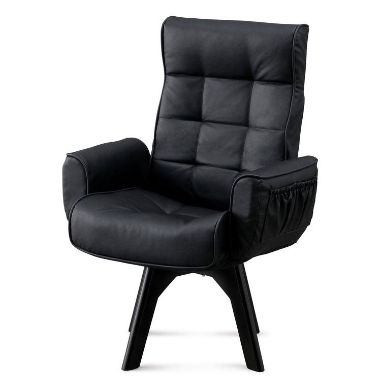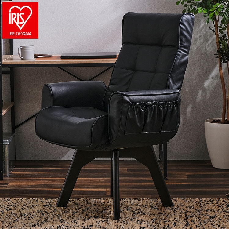 快適性とインテリア性を併せ持ったレザー調の回転チェアです。座面が360度回転するので、立ち上がり時や物を取る時も便利です。座面が高いので座りやすく、立ち上がりも楽にできます。また、厚みのある肘掛けは、立ち座りの際に便利です。身体にフィットする座り心地で長時間座っていても快適です。使用しない時は、背面をたたむことができます。小物収納に便利なポケット付きです。お客様組み立てとなります。