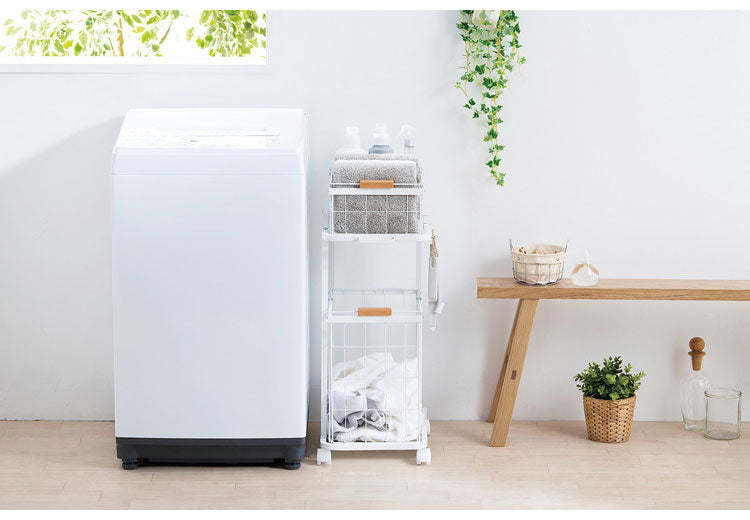 機能的なバスケット付きのランドリーワゴンです。大・小のバスケットは洗濯物の仕分けや小物収納に便利です。上段は取り出しやすい浅型バスケットで、下段はたっぷり入る深型バスケットです。ナチュラルな木製の取っ手付きで、温かみがありアクセントになります。ワゴンは支柱が少なく、衣類やバスケットの出し入れが簡単に行えます。フックが2個付いています。ドライヤーなどが掛けられ、収納力がアップします。ワゴンを動かしやすい持ち手とキャスター付きです。簡単に動かせるので、お掃除もラクにできます。お客様組み立てとなります。