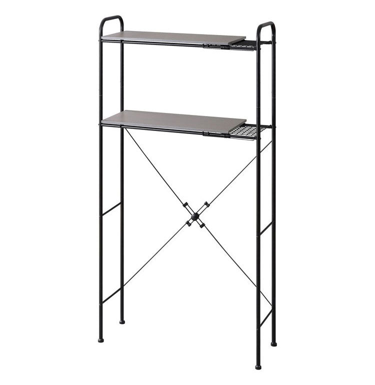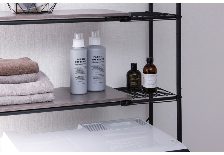 シンプルなデザインのスタイルランドリーラックです。設置場所に合わせてサイズ調節ができる幅伸縮タイプです。インテリアに馴染む木目調の棚板は、ランドリー周りをおしゃれに収納できます。約9cm間隔で6段階、収納物に合わせて高さ調整が可能です。棚板とワイヤーラックの組合せにより、伸長して使用した場合でも物が置けます。脚部アジャスターにより、がたつきを防止しています。付属している大きい脚部アジャスターを使用することで、防水パンが壁面に近いご家庭でも設置できます。お客様組み立てとなります。