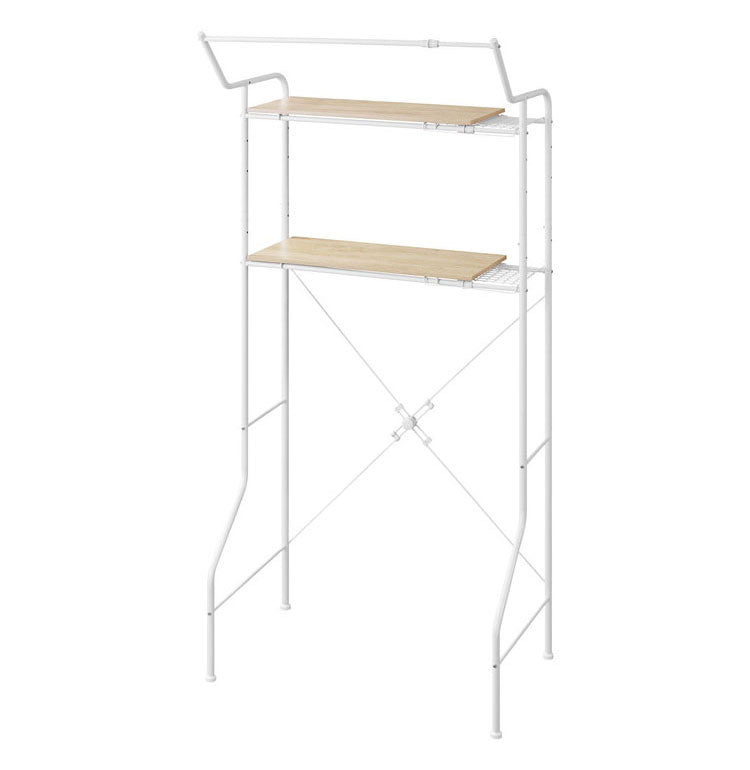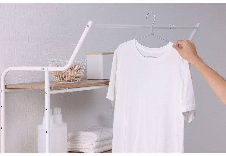 ハンガーバー付きのシンプルなデザインのスタイルランドリーラックです。ハンガーバーはバスマットやバスタオル、洗濯物のちょい干し、ちょい掛けなどに便利です。設置場所に合わせてサイズ調節ができる幅伸縮タイプです。インテリアに馴染む木目調の棚板は、ランドリー周りをおしゃれに収納できます。約9cm間隔で6段階、収納物に合わせて高さ調整が可能です。棚板とワイヤーラックの組合せにより、伸長して使用した場合でも物が置けます。脚部アジャスターにより、がたつきを防止しています。付属している大きい脚部アジャスターを使用することで、防水パンが壁面に近いご家庭でも設置できます。お客様組み立てとなります。