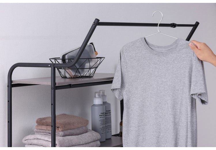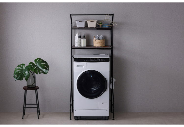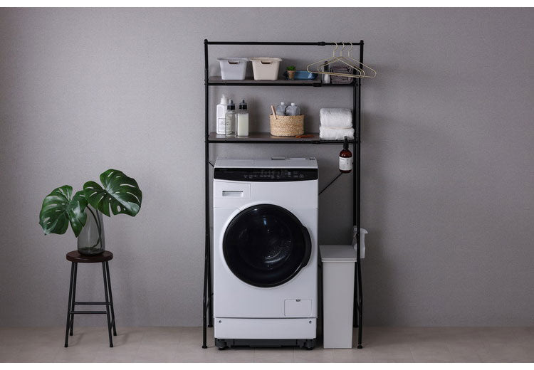 ハンガーバー付きのシンプルなデザインのスタイルランドリーラックです。ハンガーバーはバスマットやバスタオル、洗濯物のちょい干し、ちょい掛けなどに便利です。設置場所に合わせてサイズ調節ができる幅伸縮タイプです。インテリアに馴染む木目調の棚板は、ランドリー周りをおしゃれに収納できます。約9cm間隔で6段階、収納物に合わせて高さ調整が可能です。棚板とワイヤーラックの組合せにより、伸長して使用した場合でも物が置けます。脚部アジャスターにより、がたつきを防止しています。付属している大きい脚部アジャスターを使用することで、防水パンが壁面に近いご家庭でも設置できます。お客様組み立てとなります。