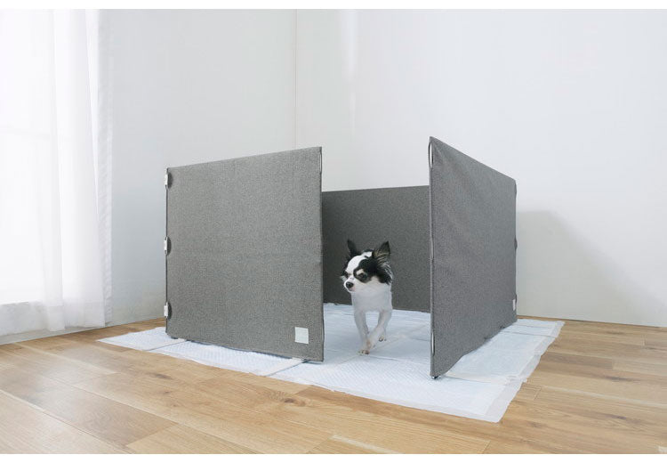 インテリアに馴染む、カバー付きペットフェンスです。ペットフェンスにカバーを付けることで部屋に馴染み、ペットとの距離をより近く感じます。カバーには、杢感のある糸をざっくりとしたテクスチャー(生地感)のななこ織に織上げた生地を使用しました。ナチュラルなテイストで質感も高く、お部屋のインテリアに合わせやすいです。ペットフェンスとしてはもちろん、ペットサークルとしても利用可能です。人とペットの空間を分けずに快適に過ごせます。軽量設計で移動も設置も簡単にできます。(フェンスはペットがいる部屋側に立て、脚パーツの長い方を内側にし、両端部を片側5cm以上壁に重ねて隙間がないように設置してください)。連結が簡単にできる取り付け簡単なジョイントが3個付いています。RMペットハウスと同じ生地を使用しています。一緒に使用してもまとまりある空間を演出できます。お客様組み立てとなります。