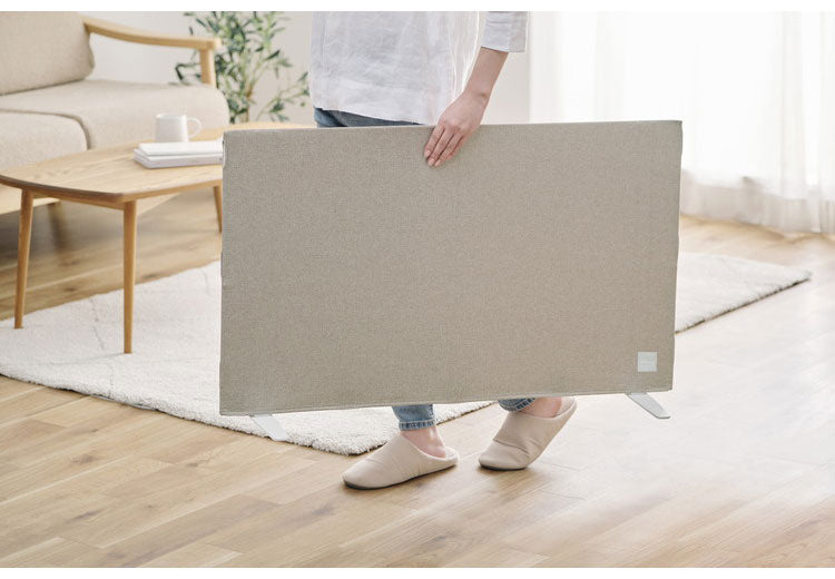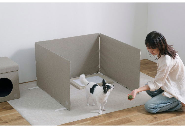 インテリアに馴染む、カバー付きペットフェンスです。ペットフェンスにカバーを付けることで部屋に馴染み、ペットとの距離をより近く感じます。カバーには、杢感のある糸をざっくりとしたテクスチャー(生地感)のななこ織に織上げた生地を使用しました。ナチュラルなテイストで質感も高く、お部屋のインテリアに合わせやすいです。ペットフェンスとしてはもちろん、ペットサークルとしても利用可能です。人とペットの空間を分けずに快適に過ごせます。軽量設計で移動も設置も簡単にできます。(フェンスはペットがいる部屋側に立て、脚パーツの長い方を内側にし、両端部を片側5cm以上壁に重ねて隙間がないように設置してください)。連結が簡単にできる取り付け簡単なジョイントが3個付いています。RMペットハウスと同じ生地を使用しています。一緒に使用してもまとまりある空間を演出できます。お客様組み立てとなります。