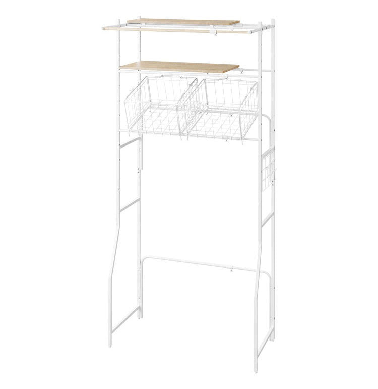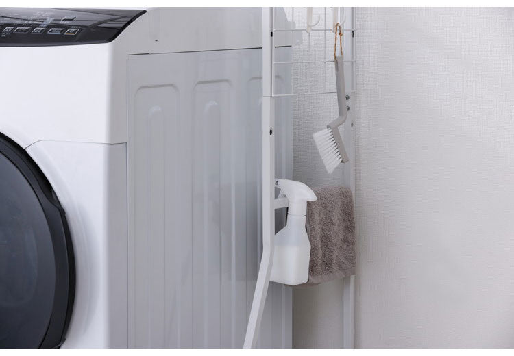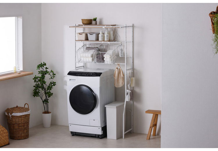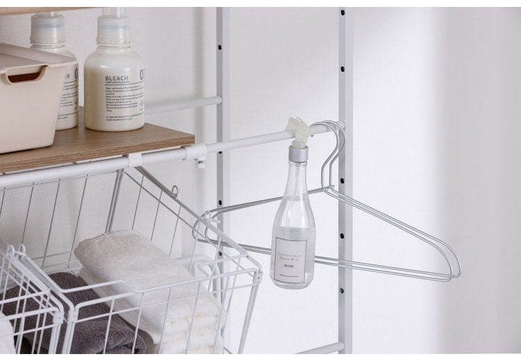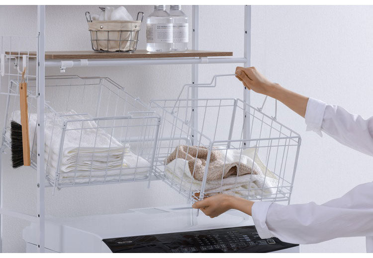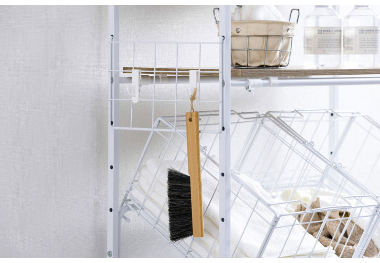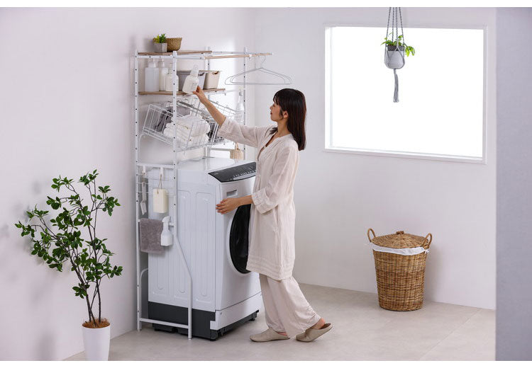 バスケット付きのシンプルなデザインのスタイルランドリーラックです。設置場所に合わせてサイズ調節ができる幅伸縮タイプです。インテリアに馴染む木目調の棚板は、ランドリー周りをおしゃれに収納できます。約8cm間隔で6段階、収納物に合わせて高さ調整が可能です。バスケットは洗濯物の仕分けやタオルの収納などに便利です。取り付け方は平行と斜めの2通りです。ハンガーバーはバスマットやバスタオル、洗濯物のちょい干し、ちょい掛けなどに便利です。フック付きのメッシュパネルは小物を掛けて収納できます。左右どちらにも取り付けられます。アジャスター付きで、ガタつきを防止します。お客様組み立てとなります。