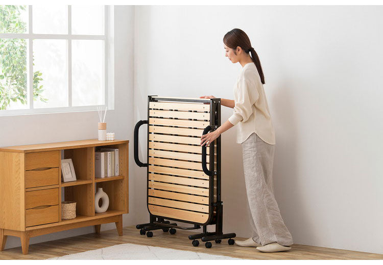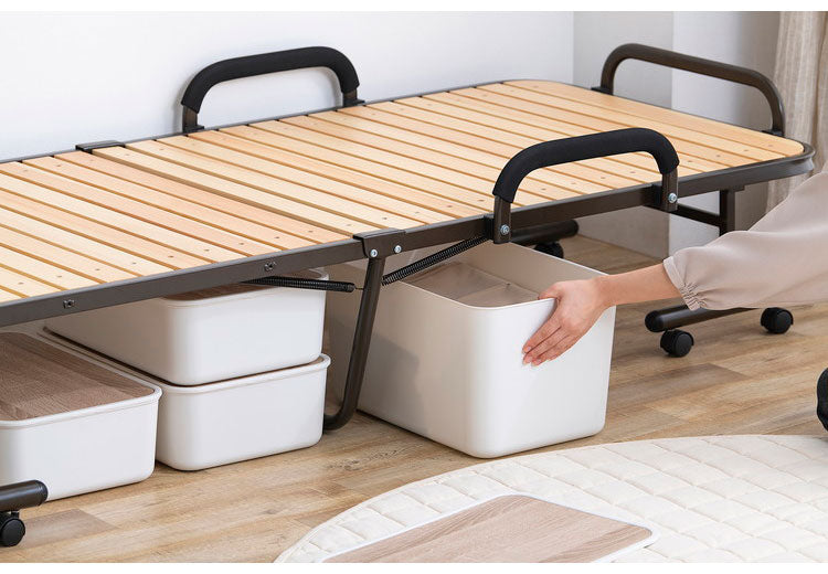通気性抜群で湿気が溜まりにくく、オールシーズン快適にお使いいただける天然木のすのこベッドです。床面までが高い高床タイプで、膝に負担がかかりにくく立ち上がれる構造です。指を挟みにくい中間脚を採用し、安全面にも配慮しています。ストッパーピン付きで、ベッドが浮き上がるのを防止します。折りたたみ時や移動時に便利なサイドグリップ付きです。サイドグリップは2本付きで、取り付け位置は4か所から選べます。握りやすい形状です。キャスター付きで、移動が楽に行えます。4か所ロック付きです。ベッド下は収納スペースとして有効活用できます。お客様組み立てとなります。簡単組み立てです。