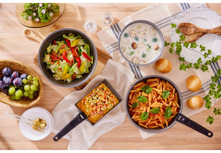 【セット内容】 フライパン26cm、炒めなべ26cm、なべ16cm・20cm、エッグパン、ガラスふた16cm・20cm・26cm、PEシールふた16cm・20cm、専用マルチハンドル2本【満水容量(約)】 フライパン26cm:2.9L、炒めなべ26cm:3.2L、なべ16cm:1.6L、なべ20cm:2.9L、エッグパン:1.1L