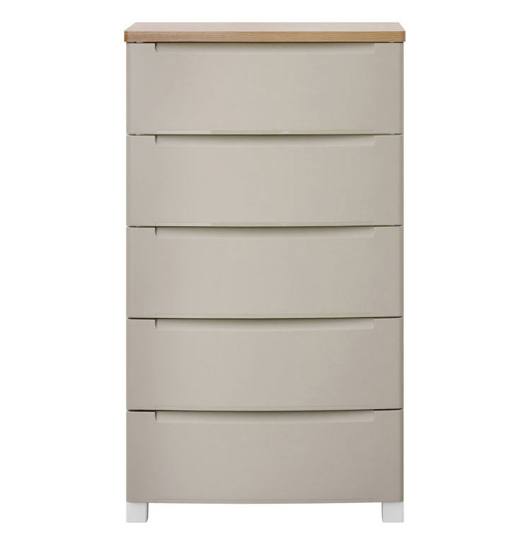 落ち着いたカラーとシンプルなデザイン、質感にこだわった使いやすいチェストです。工具不要で簡単に組み立てができます。前パネル・側面・背面は、ツヤ消しのシボ加工を施すことで落ち着きのあるマットな質感です。天然木を思わせる木目調でインテリアのアクセントにもなります。側面・背面はパネルがあるフルカバー設計で、ほこりが入りにくく大切な衣類を守ります。約4.3cmの脚付きでお掃除がしやすくなっています。