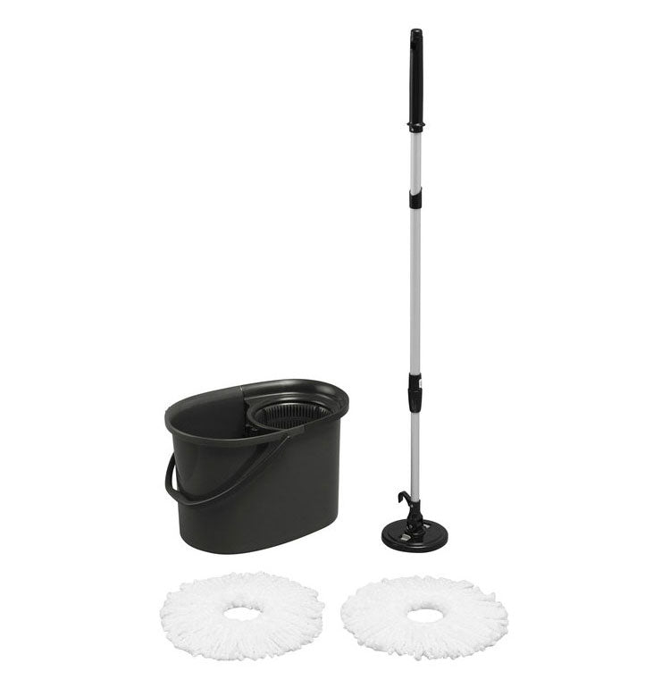 水切りしやすい手回しタイプの回転モップです。モップを手で上下するだけで、モップの洗浄と脱水が行えます。マイクロファイバーモップでしっかり汚れをキャッチします。モップヘッドはレバーで簡単に着脱できます。専用モップヘッドが2個付いています。交換に便利です。濡れたモップ乾燥させるのに便利なフック付きです。モップの柄は軽くて使いやすいアルミパイプです。