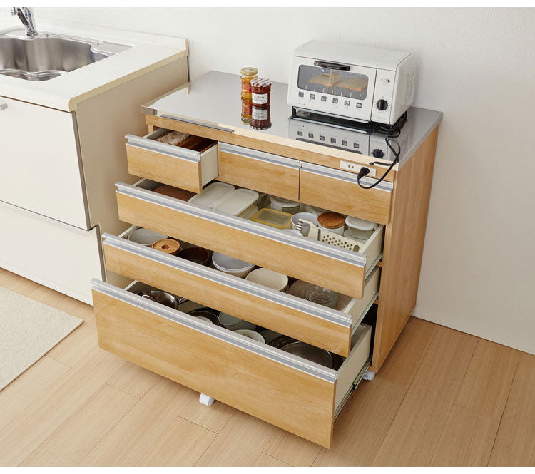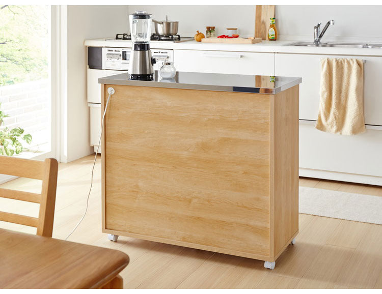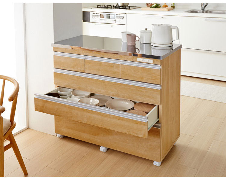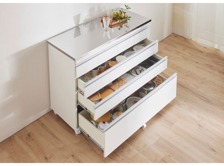 キッチンカウンター 間仕切り ステンレス天板 幅90 完成品 国産 背面化粧仕上げ 鏡面仕上げ 【開梱設置無料】 キャスター付き 4段 レンジ台 レンジラック 食器棚 キッチンワゴン(代引不可)