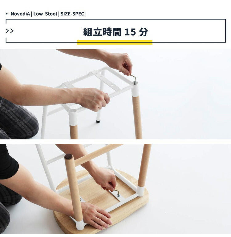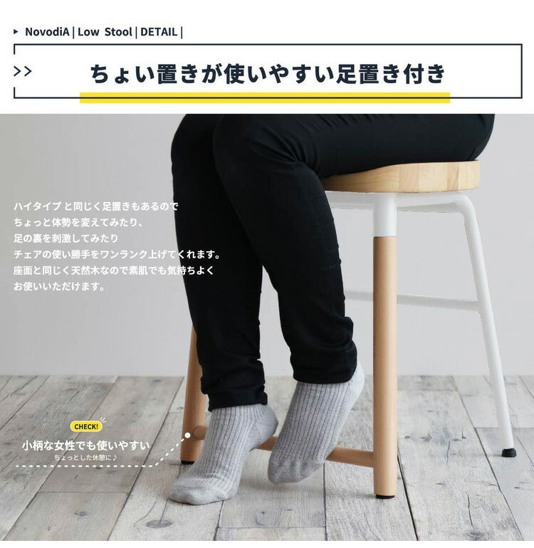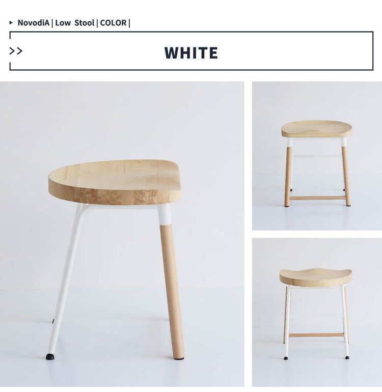 NovodiAスツールのロータイプ。ダイニングテーブルにも合わせやすく、お子さんも座りやすい高さです。季節を問わずご利用いただけるスツールです。座面は曲線を描き、身体にフィットするデザインとなっております。