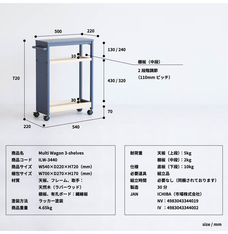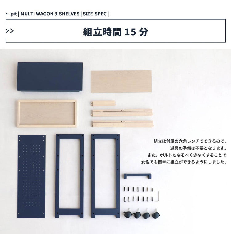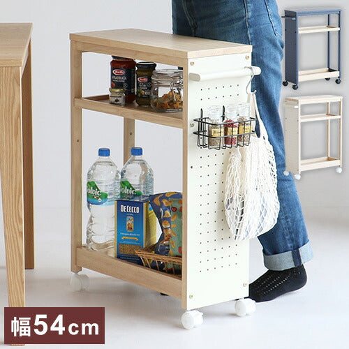 マルチワゴン 幅54cm キッチンワゴン 3段 キャスター付き 隙間収納 天然木 スリム おしゃれ 北欧 キッチン収納 アイボリー ネイビー 調味料 レンジ 炊飯器 整理(代引不可)
