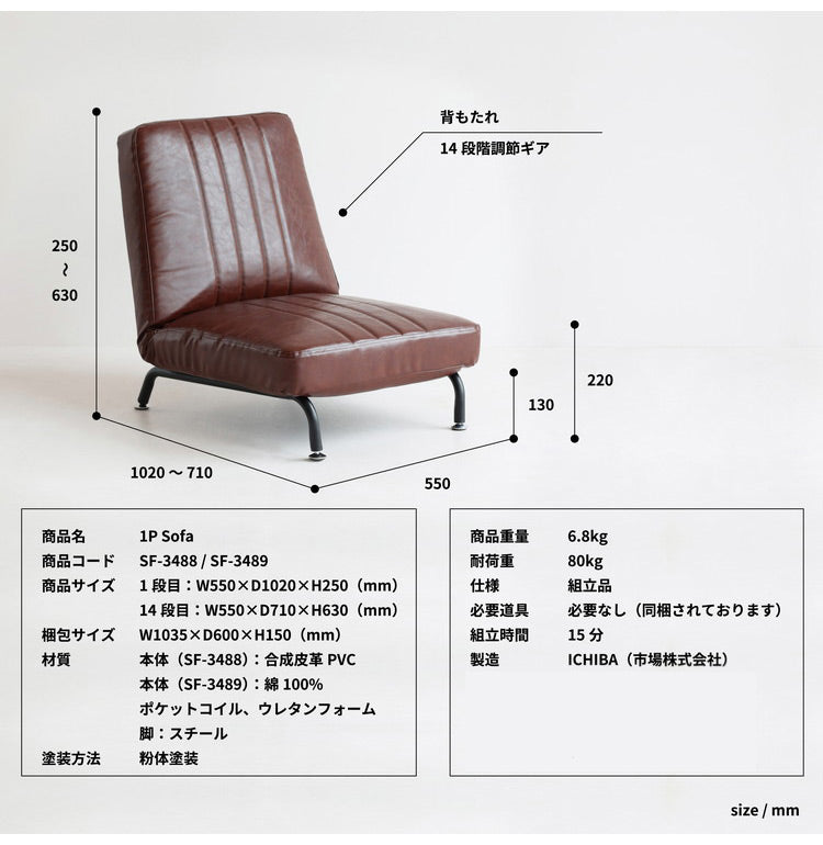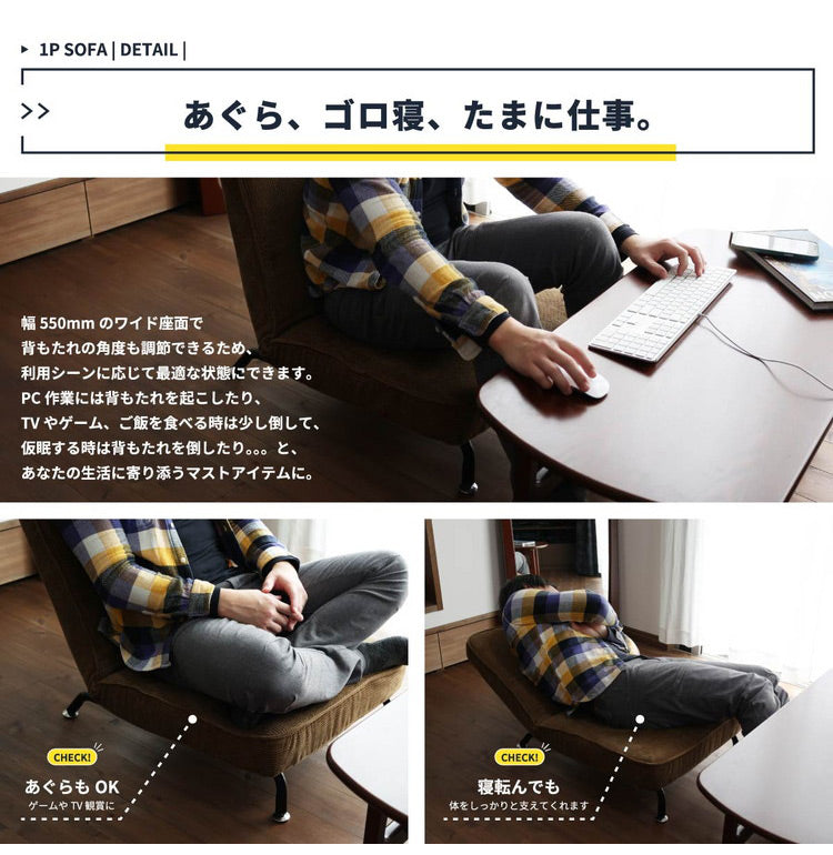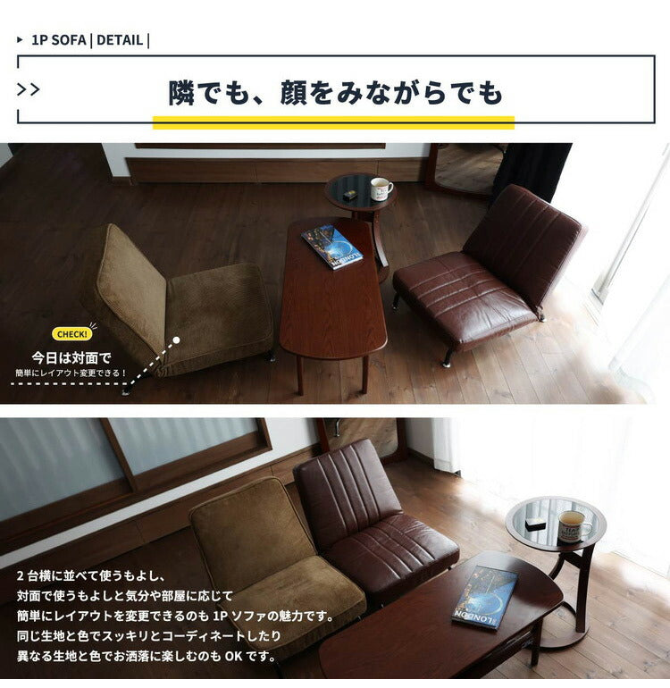 14段階の角度調整ギア付きの1Pソファ(座椅子)。2色からお選びいただけます。