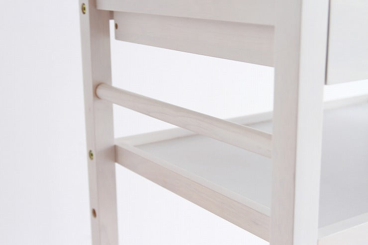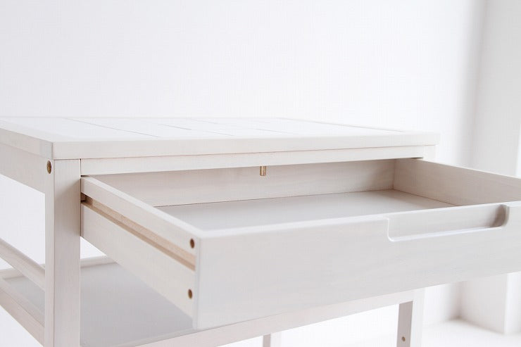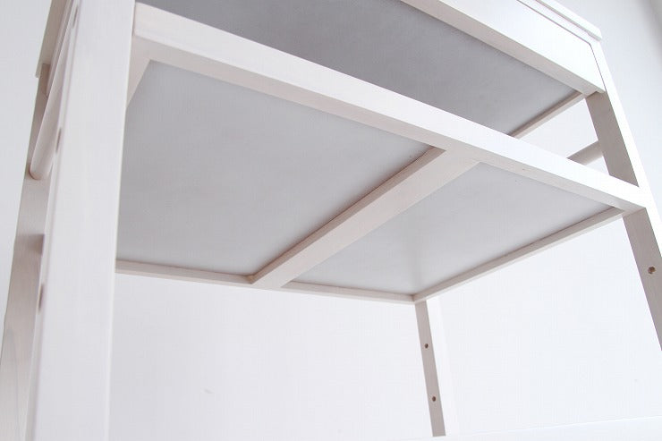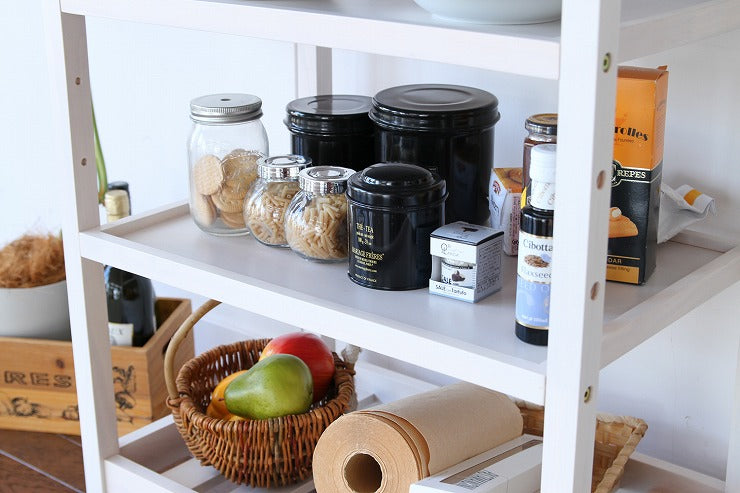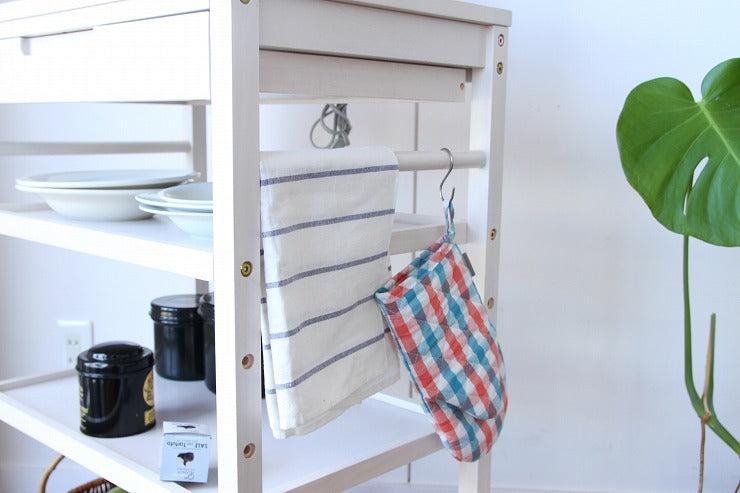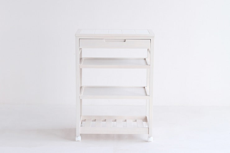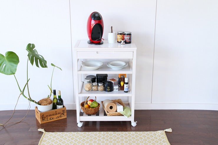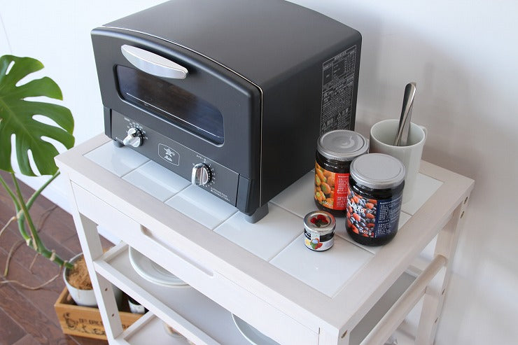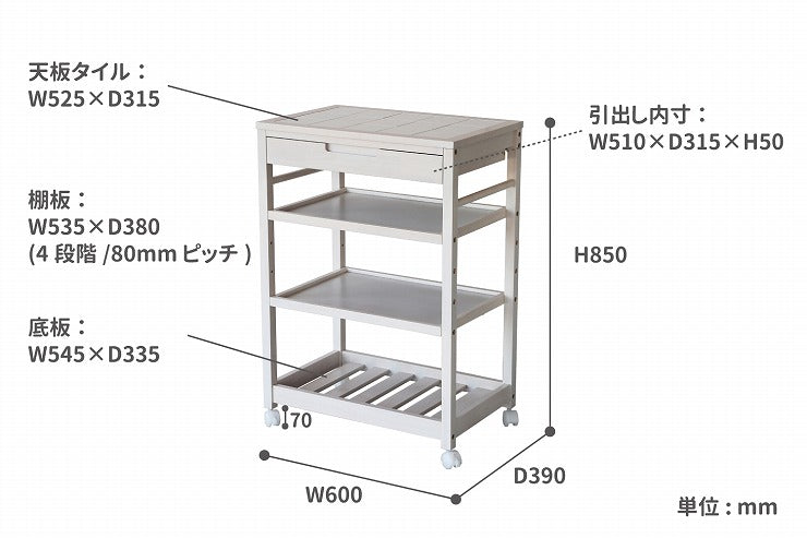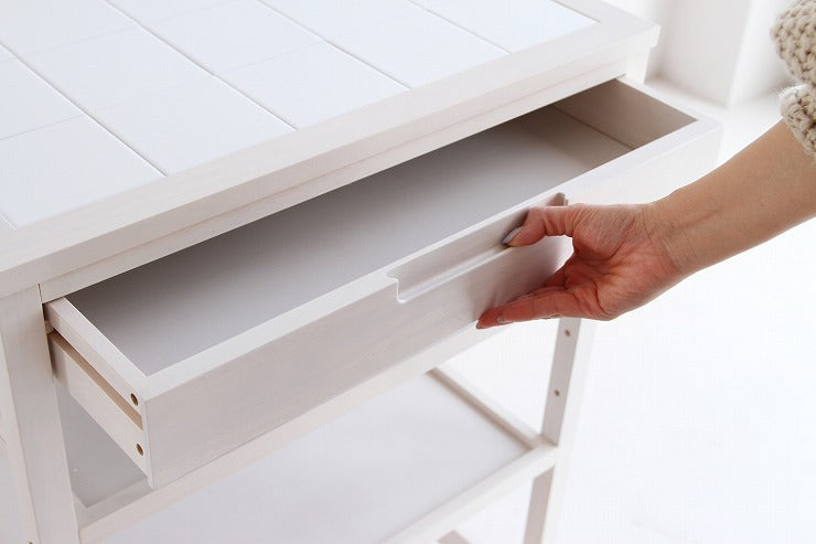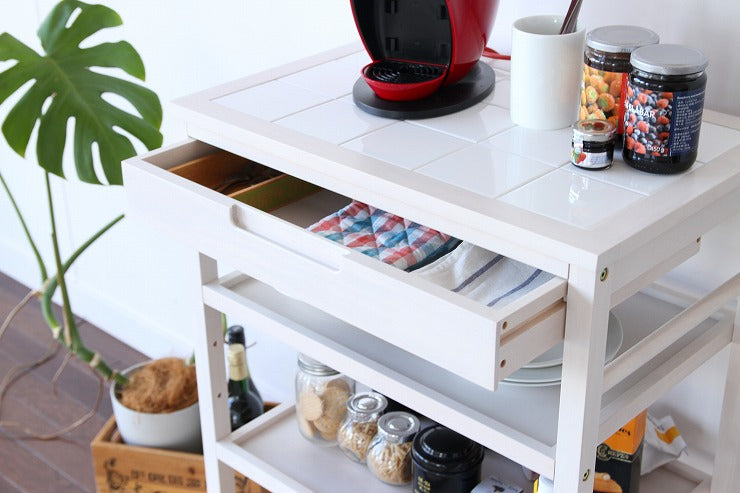 熱いお鍋などが置けるタイルトップ、キッチン用品がたっぷり収納できる引き出し、高さ調節可能な棚板、収納力と機能性を兼ね備えております。