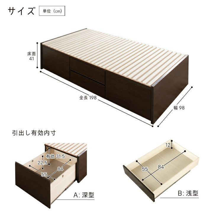 引き出しの奥行き(内寸)84cm で、たっぷり収納できるチェストベッドです。