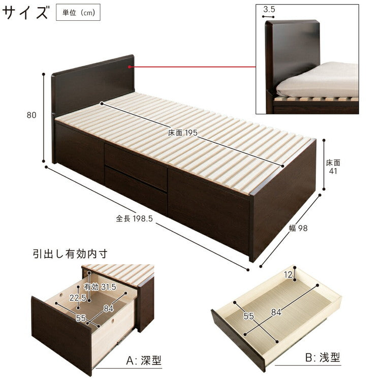 引き出しの奥行き(内寸)84cm で、たっぷり収納できるチェストベッドです。